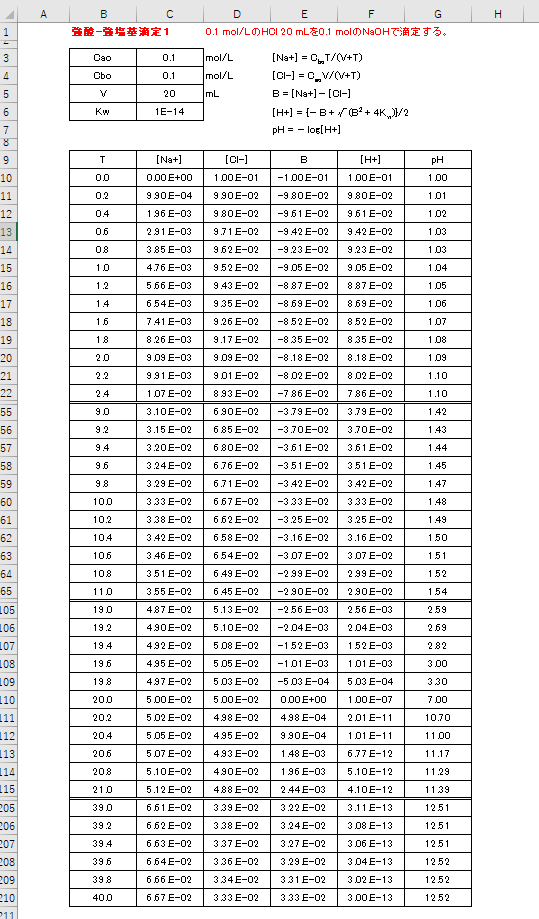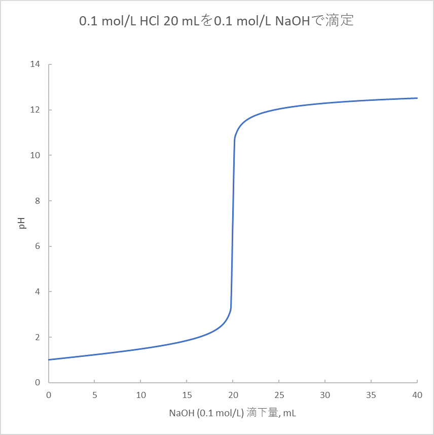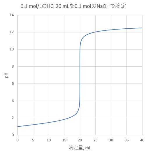 今回も水酸化ナトリウムで塩酸を滴定する場合ですが、前回とは逆に、pHを与えて滴下量を求める方法です。この方法は、pHを任意に指定できるので、中和点付近のpHが急激に変化する部分を滑らかに描くことが簡単にできます。