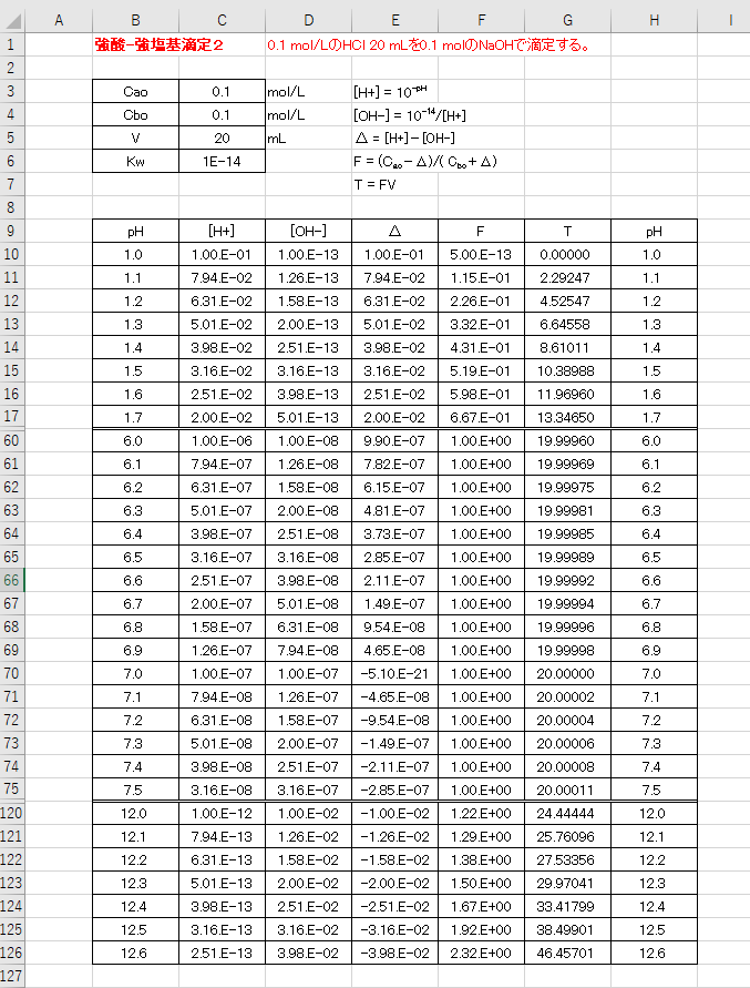 これが、滴下量Tと[H+],[OH-]の関係式です。