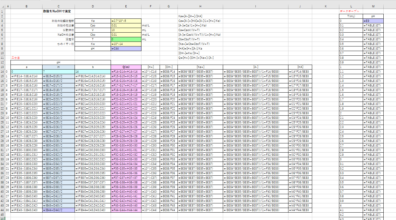 今回は、1価の弱酸を1価の強塩基で滴定する場合です。例として、NaOHによる酢酸(HAと略す)の滴定を取り上げます。エクセルシートの作成には、「二分法」と「データテーブル」を利用します。