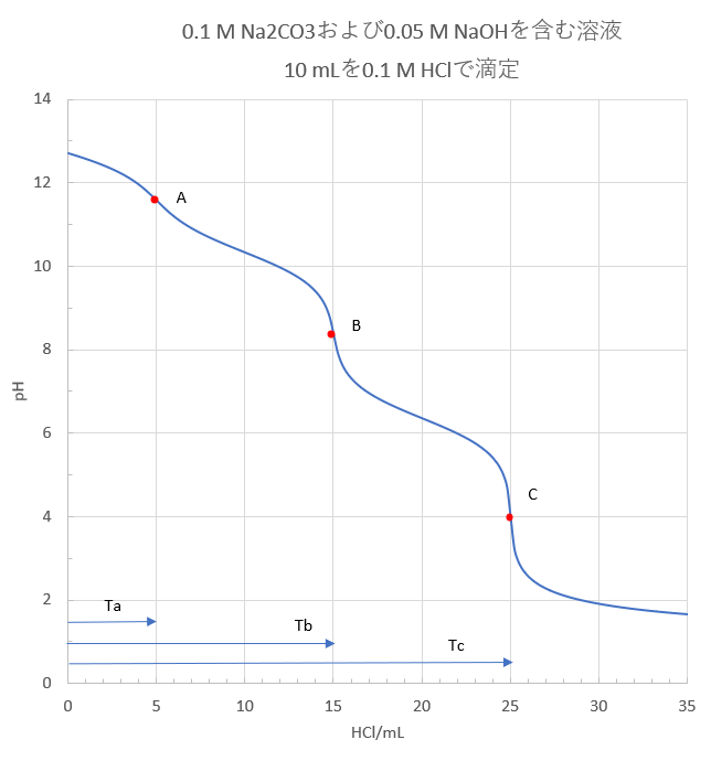B点はフェノールフタレインで検出できます。TbはNaOHとNa2CO3が1価の塩基として中和されたときの体積になります。
