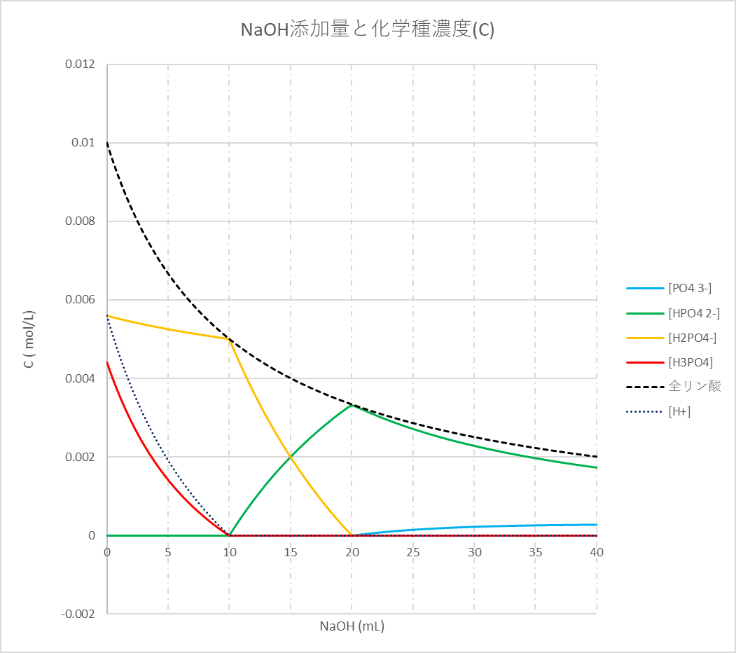 0.01 mol/Lリン酸10 mLを0.01mol/LのNaOHで滴定したときの滴定曲線および化学種濃度の分布を図-1, 図-2に示します(図-1中の化学種濃度は対数表示)。