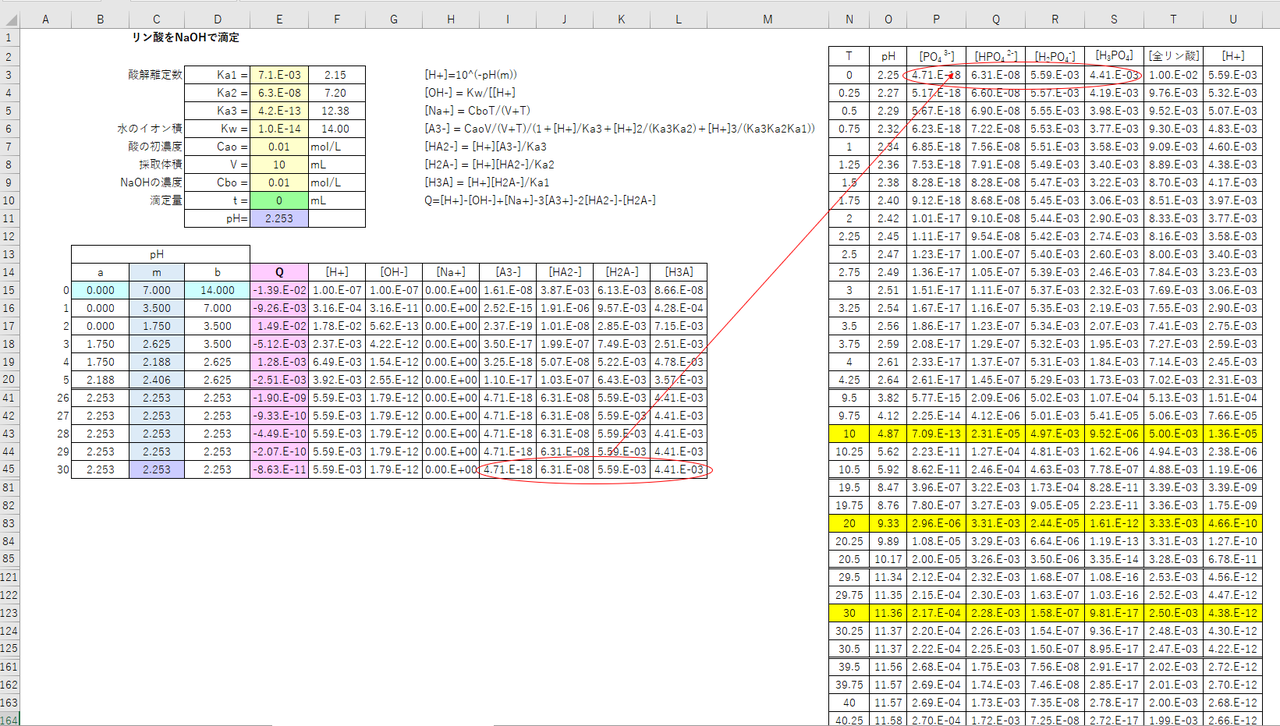 二分法の表を図-3(A列~L列)に示します。二分法表の最後の行は、T値に対するH+, OH-, Na+, PO43-,HPO42-, H2PO4-, H3PO4の濃度を与えています。