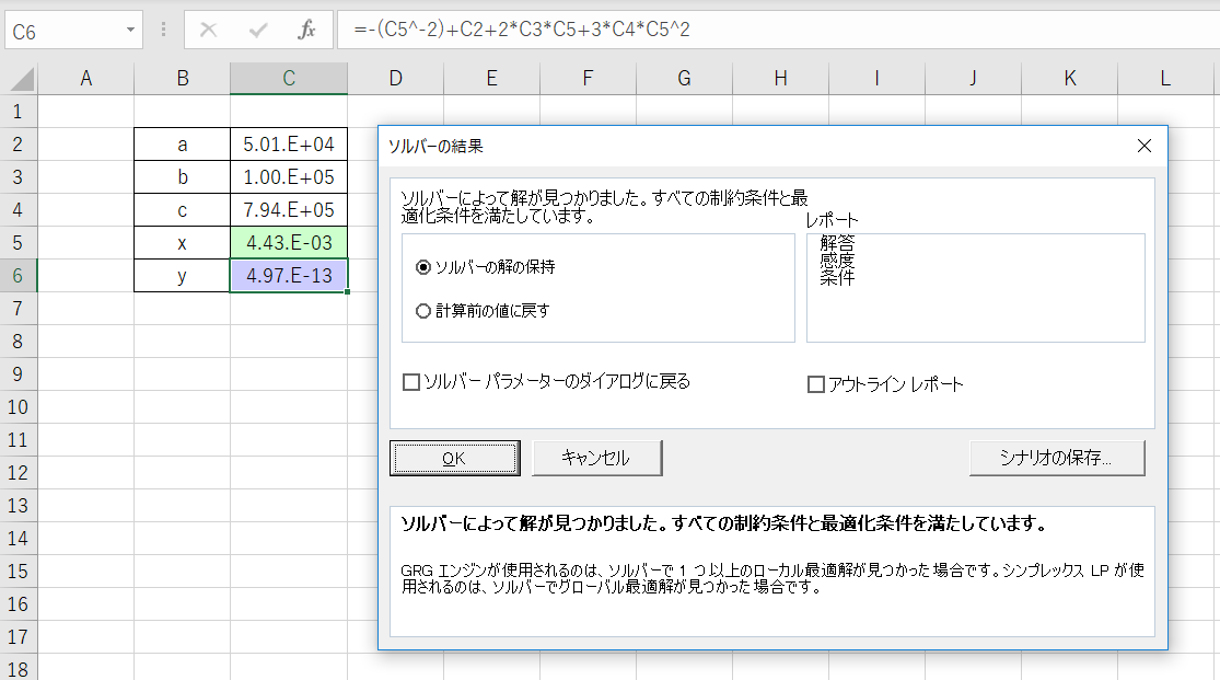 ・ソルバーの結果: 「ソルバーによって解が見つかりました」⇒「OK」