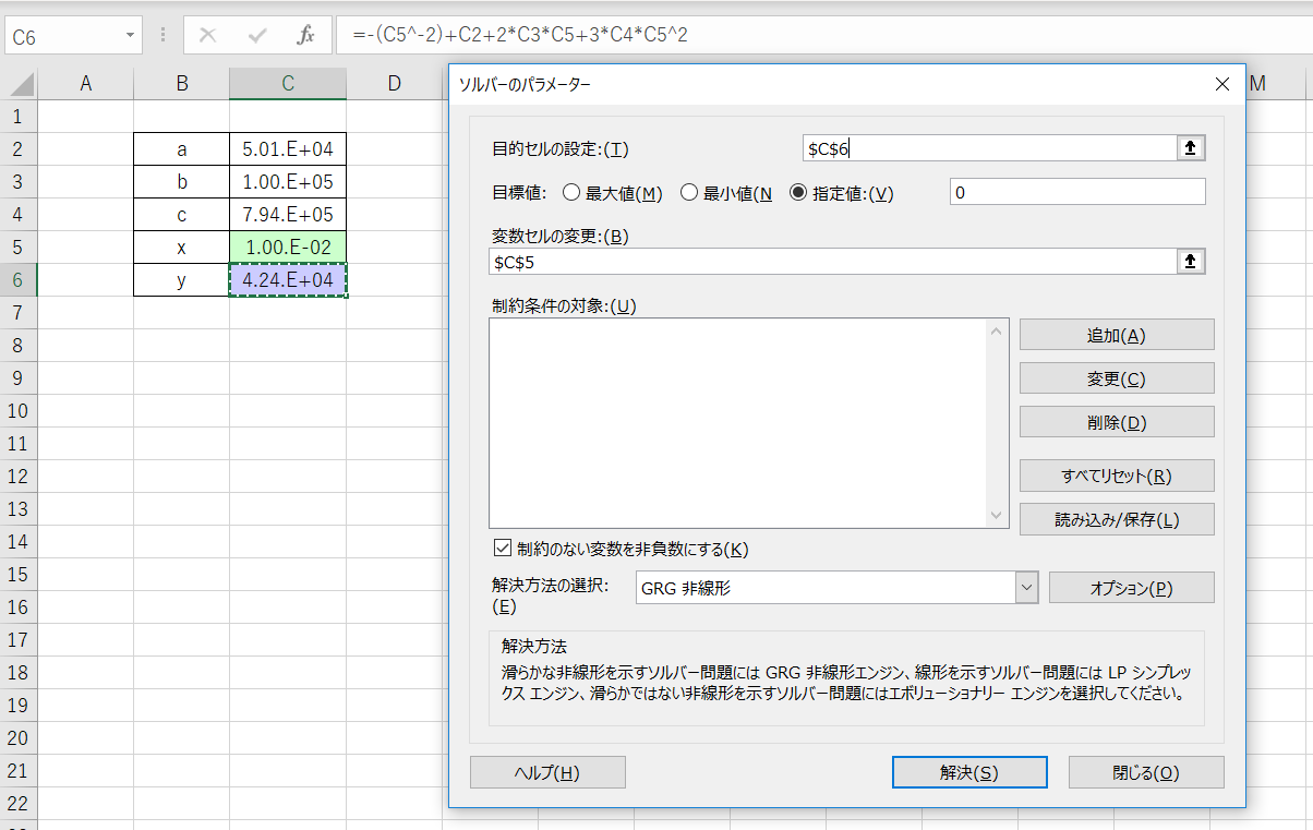 ・解決方法の選択: 「GRG非線形」を選択する。