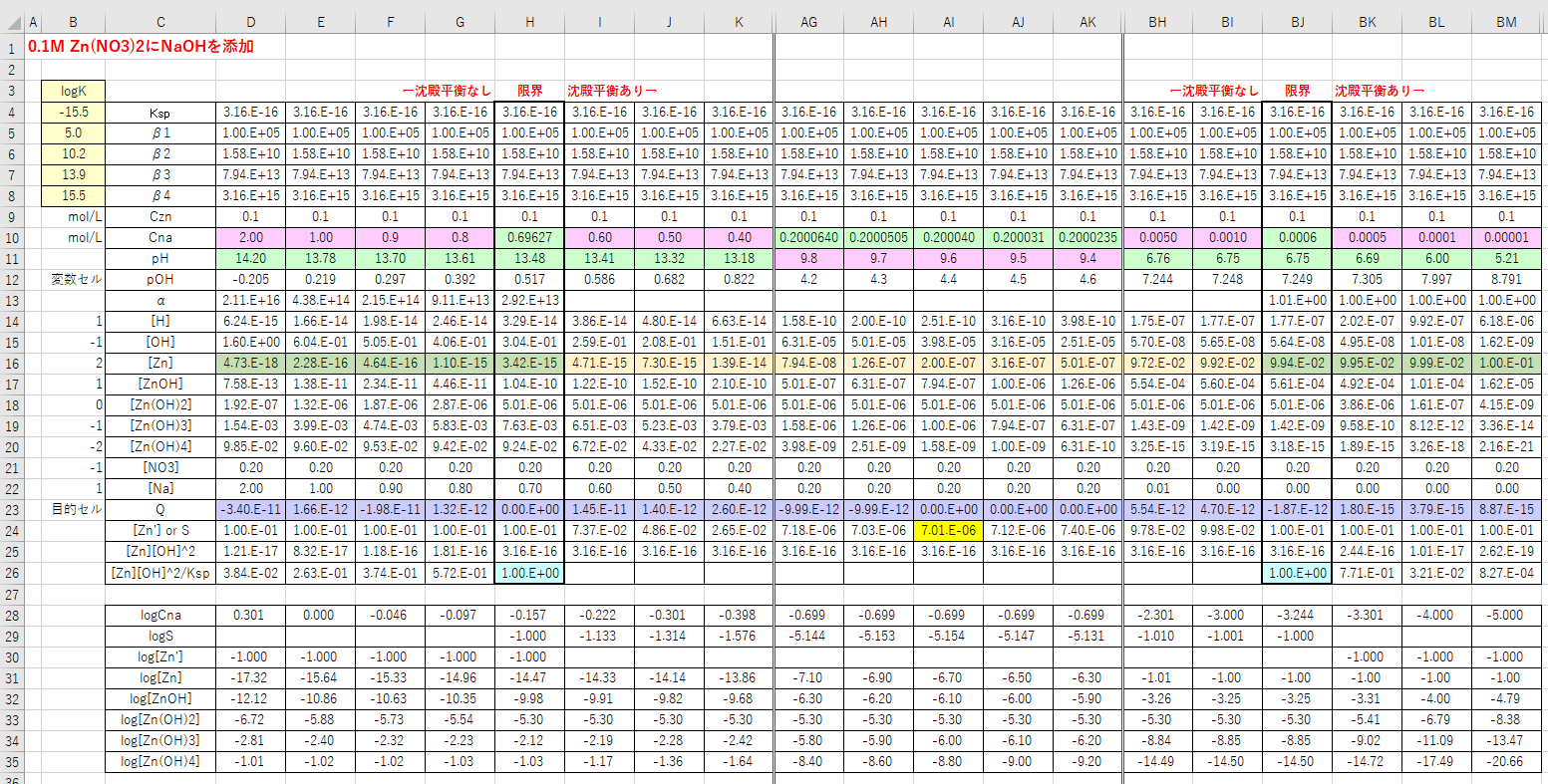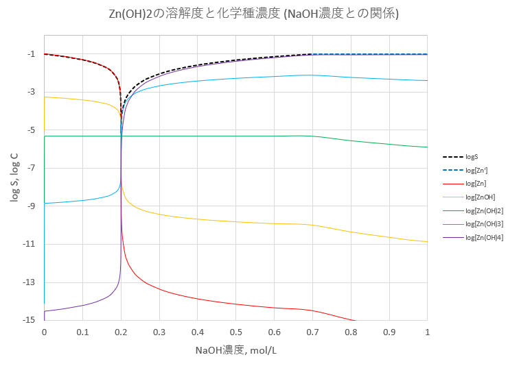 前回(2019/04/21)は、Zn(NO3)2溶液にNaOH溶液を加えたときの溶解度の様子を見ましたが、今回は前回のデータシートを使って、亜鉛に関する化学種濃度の変化について調べます。