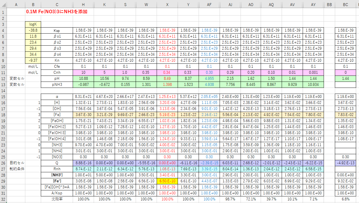 Fe3+にアンモニア水を加えたときの反応についてエクセルのソルバー機能を用いて定量的に解析します。