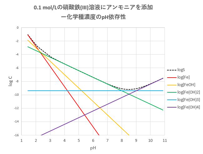*実際の硝酸鉄(III)は可溶性である。計算結果がこのようになったのはNO3-錯体、多核錯体の生成や活量係数補正を無視したためと思われる。また、硝酸鉄(III)溶液を加熱すると加水分解が進行して沈殿が生成することが知られている。