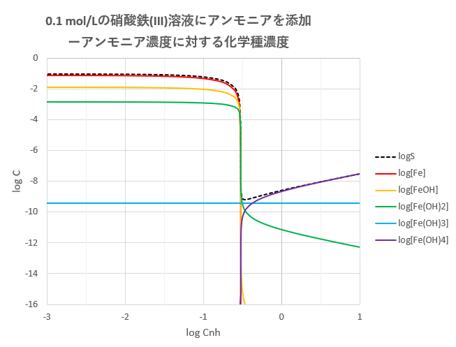 Cfe = 0.1 mol/Lとし、Cnhの値を変化させたときの鉄(III)の溶解度および化学種濃度をエクセルのソルバー機能を用いて求めます。