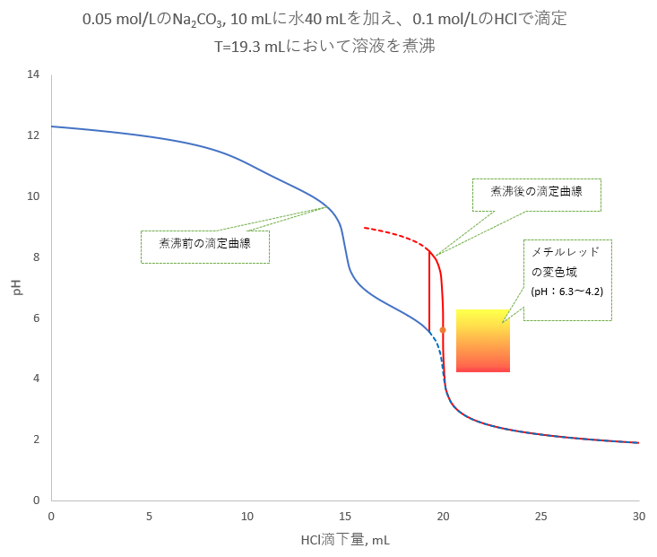 T=19.3 mLまでは通常の滴定曲線(青い線)ですが、T=19.3 mLにおいて煮沸すると、CO2は大気中に放出され、pHは5.6から8.2へと上昇します。さらに滴定を続けると当量点(pH=5.6)の前後で急激なpH変化が見られます(赤い線)。したがって非常に精度の良い滴定が可能となります(*1)。
