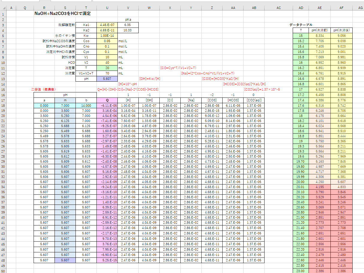 これらの関係式から、二分法を用いてTとpHの関係を求めます。
