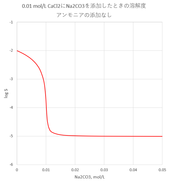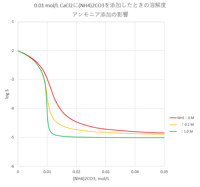 CaCl2およびNH3の濃度がそれぞれ、Cca = 0.01mol/L, Cn =0, 0.2, 1 mol/L の溶液に(NH4)2CO3を添加したときの溶解度を図-1に示します。また、比較のため(NH4)2CO3の代わりにNa2CO3を添加したときの溶解度を図-2に示します。