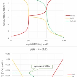 2019/05/26に塩化物イオンの銀滴定について説明し、その後半部分でモール法における指示薬(クロム酸カリウム)の適切な添加量について考察しました。今回はその補足として、クロム酸カリウムを加えて銀滴定をしたときの、銀イオン、塩化物イオン、クロム酸イオンの濃度変化の ...