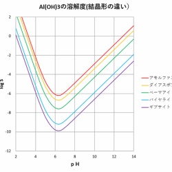 水酸化アルミニウムの沈殿は生成条件の違いによっていくつかの結晶形があり、それぞれ溶解度積(Ksp)が異なります。結晶形の違いによる溶解度の変化の様子を調べます。 アルミニウム塩の溶液に常温でアルカリを添加すると直後、主に無定形(アモルファス)の沈殿が得られます。 ...