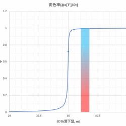 「カルシウムのEDTA滴定(2)」(2020/05/17)で述べたように、pHの増加とともに、滴定曲線のジャンプの程度は大きくなります。今回は滴定可能なpH条件と適切な指示薬について考察します。 Ca-EDTA滴定が定量的となる条件金属イオンMをEDTAで滴定するとき、M’ + Y’⇄ MYKf’ ...