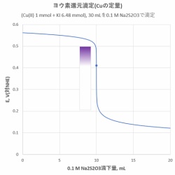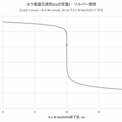 2価の銅イオンに弱酸性でヨウ化物イオンを加えるとヨウ化銅(I)が沈殿し、同時にヨウ素を生成します。生じたヨウ素をチオ硫酸ナトリウムで滴定することにより、銅を定量することができます。このような滴定法は「ヨウ素還元滴定法」と呼ばれます。このときの滴定曲線を、当量 ...