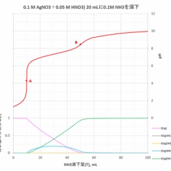 前回(2022-02-27)に続き、沈殿反応を伴う酸塩基滴定の例です。今回はAgNO3とHNO3の混合溶液をNaOHで滴定するときの滴定曲線を描きます。この場合、滴定途中でAg2Oの沈殿を生じるので、滴定剤の添加量ごとにエクセルのソルバー機能を用いてpHの解を求めます。 <<関係式 ...