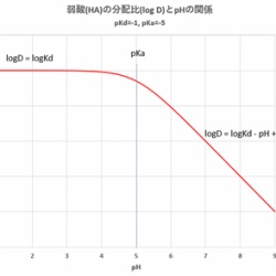 前回(2022-05-01)は弱酸の分配平衡について調べましたが、今回は塩基および両性化合物について調べます。 <<塩基の分配平衡>> 塩基の分配平衡も、酸の場合と同様に取り扱うことができます。アルキルアミン(RNH2)を例にとって考えます。RNH2の分配定数をKdとし、酸解離定数を ...