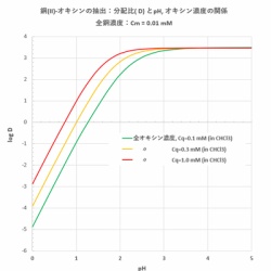 金属キレートの抽出平衡の例として、銅-オキシンキレート錯体をクロロホルムへ抽出するときの抽出平衡を取り上げます。 <<銅-オキシンキレート-クロロホルム抽出平衡>> Cq mol/Lのオキシン(HQ)とCm mol/Lの銅イオンCu2+を含みpHを調節した溶液から、無電荷のキレートC ...