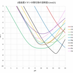 pHの異なる溶液に対する様々な金属水酸化物の溶解度を求め、pHと溶解度の関係を調べます。また、水酸化物沈殿による分離方法を考えます。 具体的には、2価の金属(M2+)あるいは3価の金属(M3+)について、溶解度積(Ksp)および水酸化物錯体の生成定数(βn)の値から、pHと ...