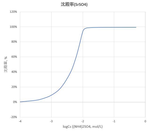 (NH4)2SO4の添加濃度がおよそ1×10^-4mol/L以上でSrSO4の沈殿の生成が始まります。また、当量よりやや過剰に(NH4)2SO4を添加すれば定量的に沈殿が生成することがわかります。