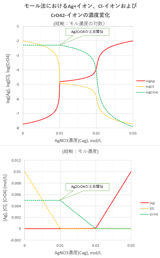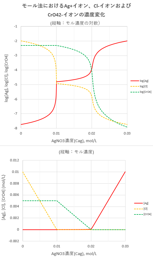 具体的に、Ccl=0.01 mol/LのNaClおよびCcr=0.005 mol/LのK2CrO4を含む試料溶液にAgNO3濃度がCag mol/LとなるようにAgNO3を添加していくことを考えます。話を簡単にするためにAgNO3の添加によって溶液の体積は変化しないものとします。