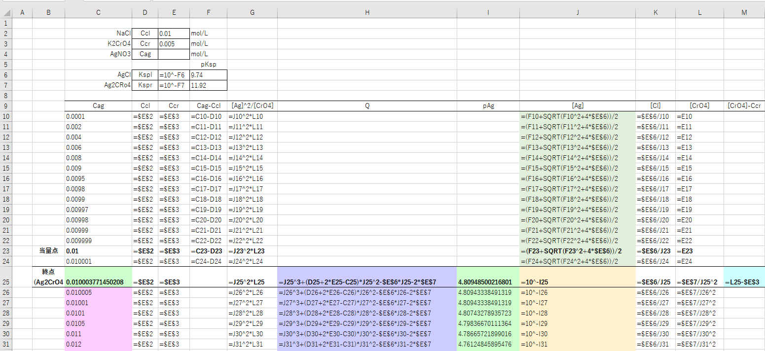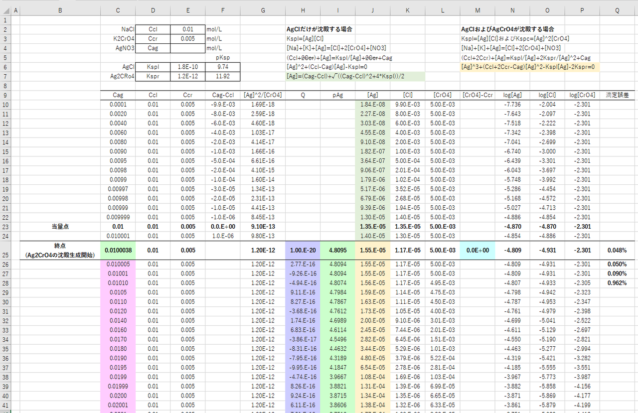 Ag2CrO4が沈殿を始めた後は、②式についてソルバーを用いて[Ag], [Cl]. [CrO4]を求めます。