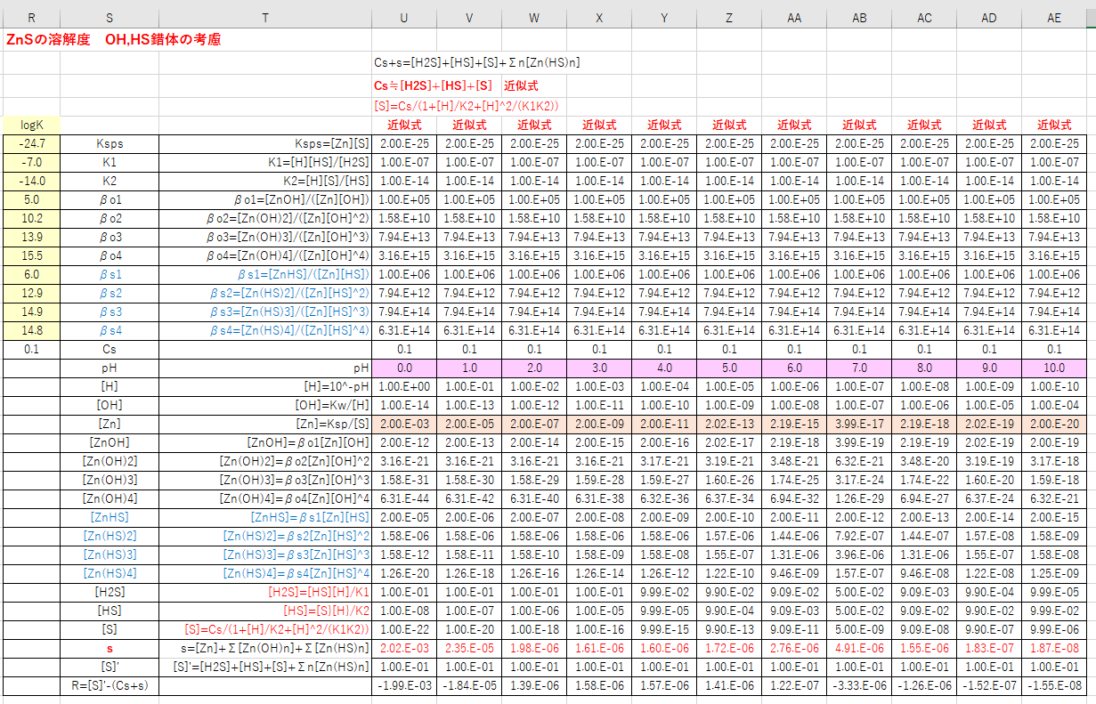 また、①式の左辺で、Σn[Zn(HS)n]の値は非常に小さく、[H2S]+[HS]+[S]に比べて無視できると考えられます。