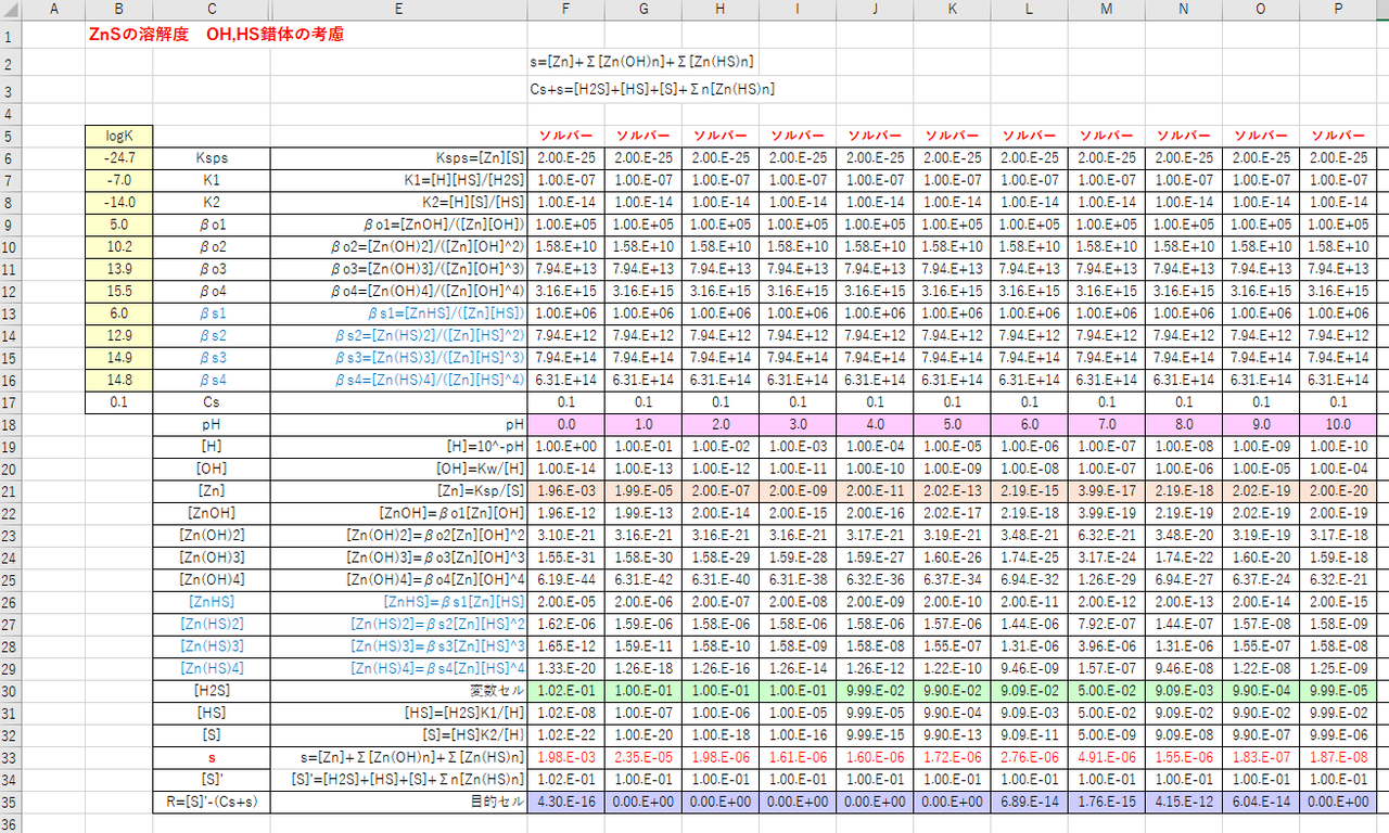 となり、pHを与えると[OH], [Zn], [ZnOH], [Zn(OH)2], [Zn(OH)3], [Zn(OH)4],[ZnHS], [Zn(HS)2], [Zn(HS)3], [Zn(HS)4], [S], [HS], [H2S]の値がすべて一義的に決まり、溶解度は