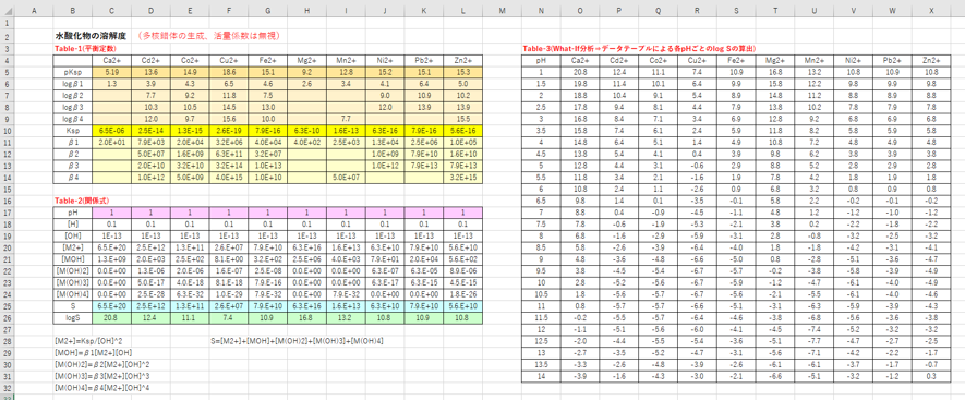 2) pH=1のときの各イオンのlog SをTable-2からtable-3にコピー&ペースト