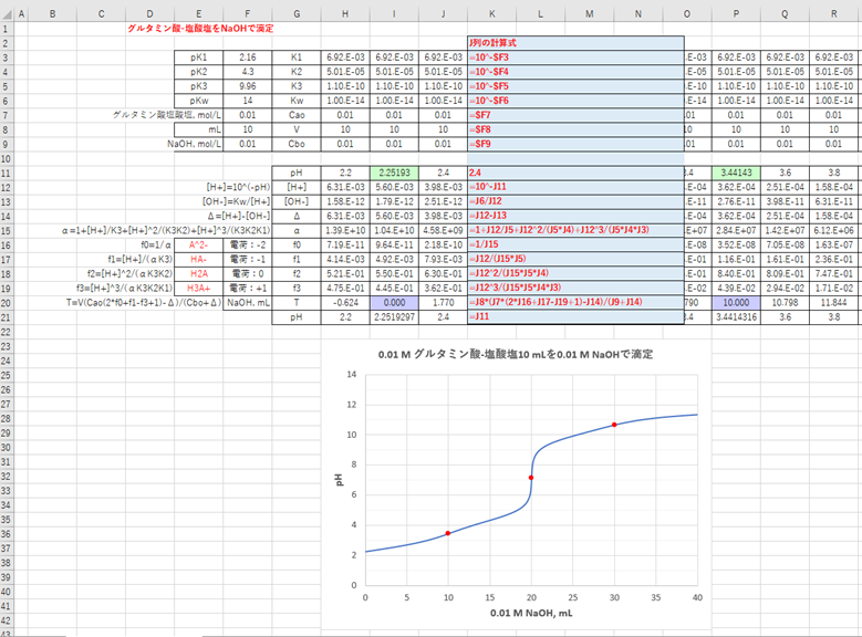 0.01 mol/Lのグルタミン酸・塩酸塩10 mLを0.01 mol/LのNaOHで滴定したときの滴定曲線を図-3に示します(滴定開始および当量点のpHはソルバーで求めました)。