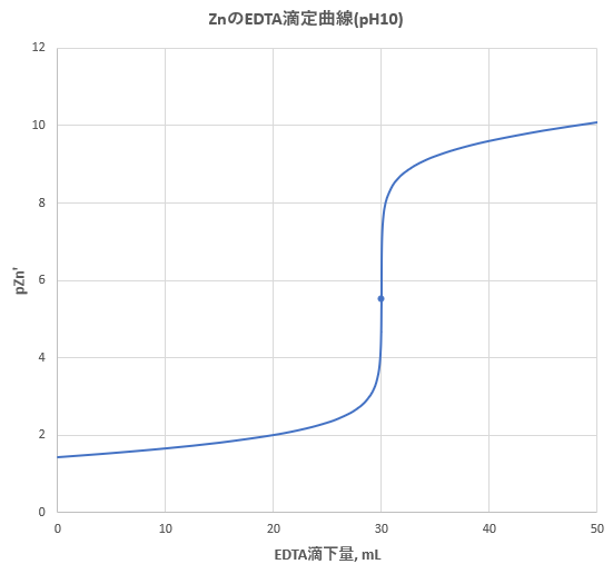 亜鉛のEDTA滴定法を考えるにあたって最低限必要な条件は、(1)水酸化物(Zn(OH)2)が沈殿しないこと、(2)Zn-EDTAの条件生成定数が十分大きいこと、(3)適切な終点検出法(たとえば金属指示薬)があること、の3点です。この滴定条件について考え、適切な条件下で滴定曲線を描きます。