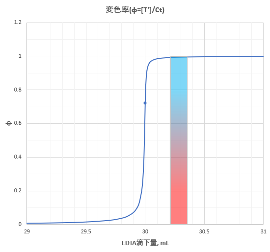 この条件の場合、当量点における変色率はφ=0.72であり、溶液の色から赤みがなくなって純粋に青色になった時点を終点とするのが適切と考えられます。また変色は非常に鋭敏で、変色率がφ=0.2から0.8まで変わるときのEDTA滴下量の差は0.033mL(相対差異:0.11%)です。これらのことから、与えられた条件においてBT指示薬を用いることは適切であることが分かります。