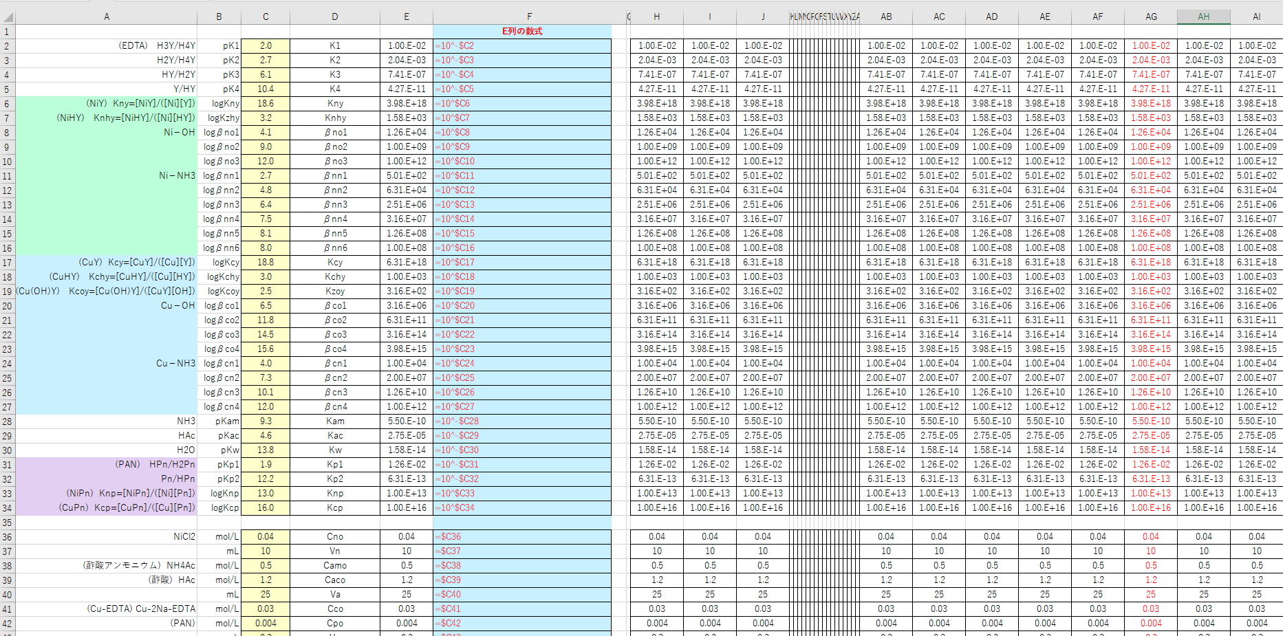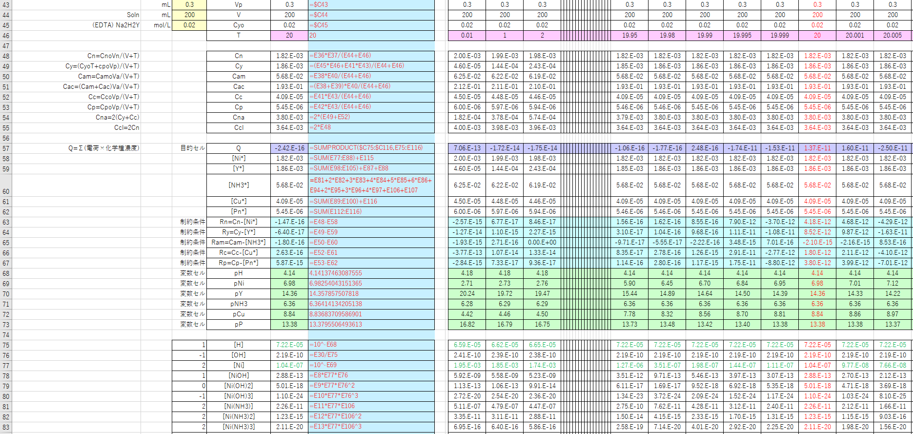 変数セル:pH, pNi, pY, pNH3, pCu, pPn