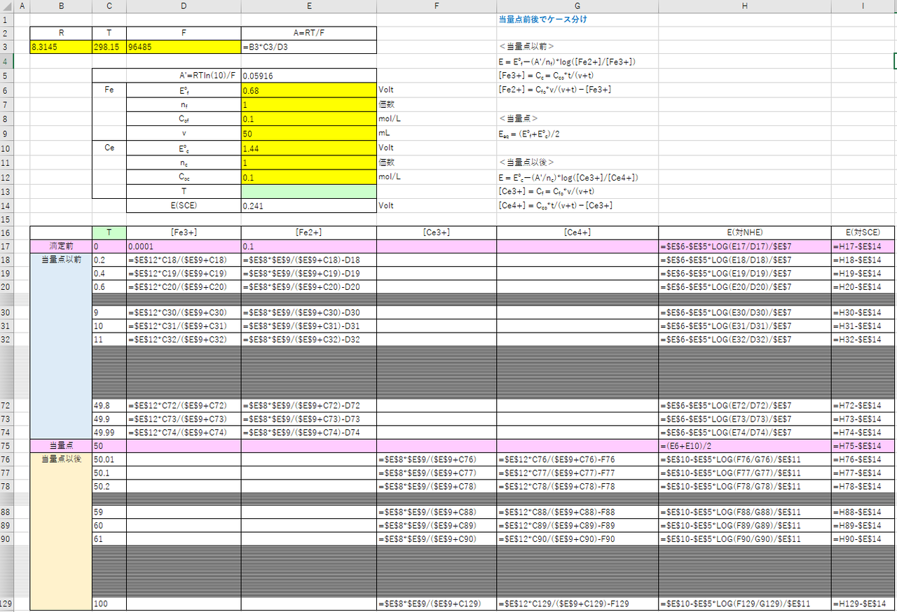 Eを求めるとき、(2'), (3')式の電位は等しいのでどちらの式を用いてもよいのですが、[Ce3+]/[Ce4+]の計算はめんどう([Ce4+]≒0なので)である一方、[Fe2+]/[Fe3+]の計算は容易にできるので、(2')を用います。