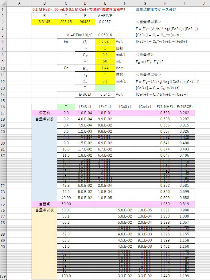 酸化還元滴定でよく用いられる「セリウム(IV)標準溶液によるによる鉄(II)の滴定」を例として、当量点前、当量点、当量点後にケース分けして酸化還元滴定曲線を描く方法を説明します。