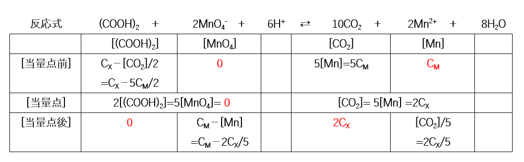 (a)式の平衡は大きく右に偏っているので、当量点前(CX>CM)では、MnO4-はほぼすべてMn2+に変化し、またMnO4-を加えた分だけ(COOH)2はCO2に変化します。