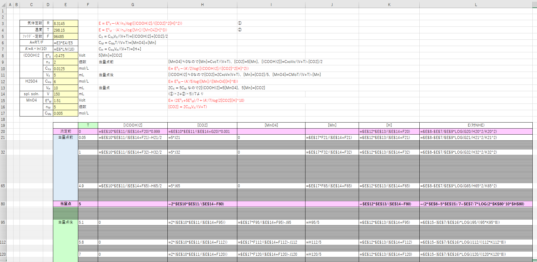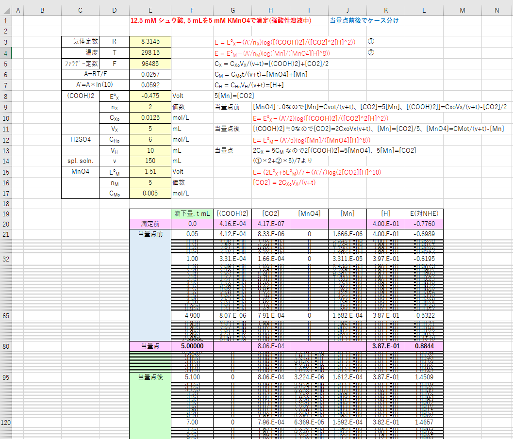 当量点後(CX<CM)は、(COOH)2はほぼすべてCO2に変化し、過剰MnO4が残るので、(2)式を用いてEを求めるのが簡単です。