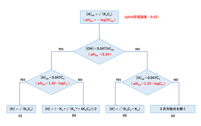 近似式による1価弱酸のpHの求め方(pHの許容誤差:0.02)を図-1のフローチャートに示します。
