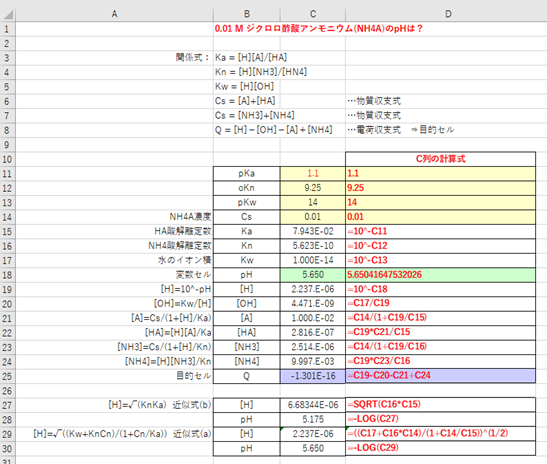 例題2:Cs=0.01mol/Lのジクロロ酢酸アンモニウム(NH4A)水溶液のpHは? pKn=9.25, pKa=1.1, pKw=14.00とする。
