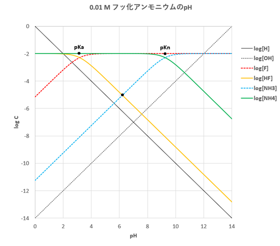 0.01 M NH4Fの場合、図-3-(a)から明らかなように [NH3]>>[OH]なので、[H]+[HF] = [NH3]が成立します。つまり、log([H]+[HF])の線とlog[NH3]の線の交点のpHが溶液のpHです。