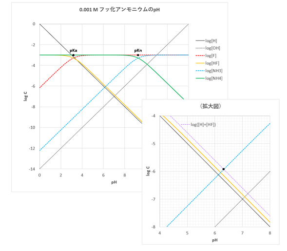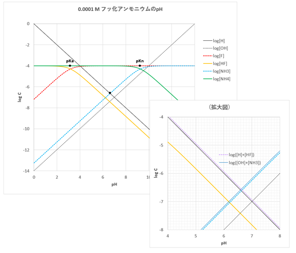 0.0001 M NH4Fの場合、図-3-(c)から、[H]+[HF] = [OH]+[NH3]、つまりlog([H]+[HF])の線とlog([OH]+[NH3])の線の交点のpHが溶液のpHです。
