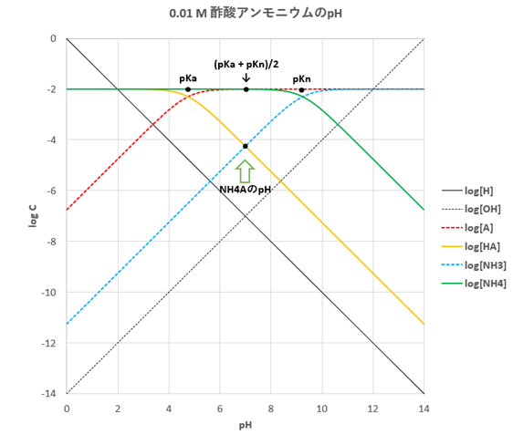 0.01 mol/Lの酢酸アンモニウム(NH4A)の対数濃度図を作成し、pHを求めます。弱酸-弱塩基の塩である酢酸アンモニウムの場合、対数濃度図は酢酸およびアンモニア両方に関する化学種の図示が必要です。