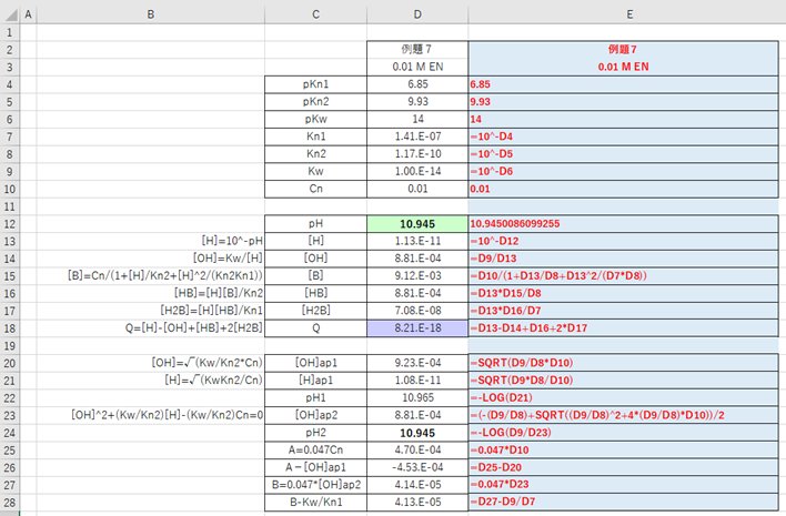 例題7:0.01 mol/L エチレンジアミン(EN:pKn1=6.85, pKn2=9.93)のpHは?