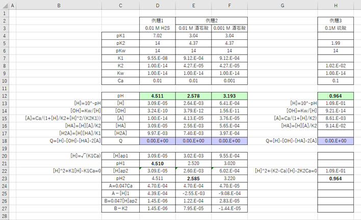 ソルバー解を求めるための関係式は、上記の二分法の表を作るための関係式と同じです。(ただし、H2SO4の場合は、[H2A]=0,