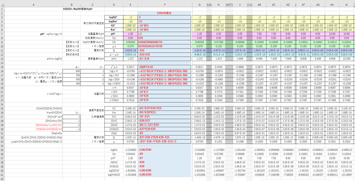 これらの関係式から、硫酸溶液にNaOHを加えた溶液についてソルバーを用いてCa, Cb,