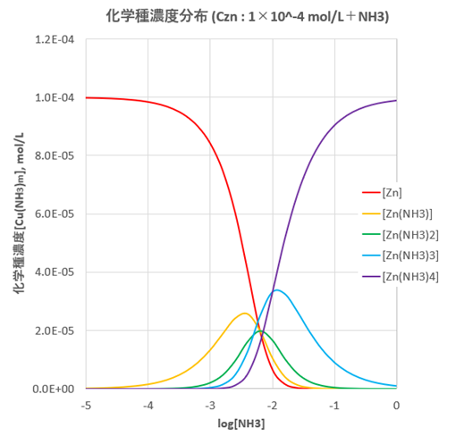 配位子濃度に対して化学種濃度を求めることがしばしば必要となります。このようなときエクセルを用いると効率的に計算することができます。上記のZn(II)イオンとNH3の平衡を例として、化学種濃度の計算を行います。