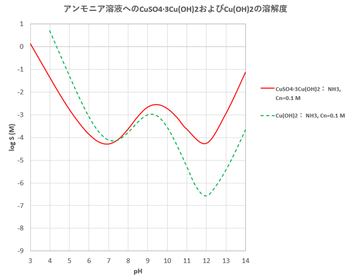 図-4から明らかなように、アンモニア濃度がCn=0.1 mol/Lの場合、pHがおよそ7より小さい場合はCuSO4・3Cu(OH)2の溶解度のほうがCu(OH)2の溶解度より小さいことがわかります。このことは、硫酸銅溶液に少量のアンモニアを加えた場合は、最初Cu(OH)2ではなく塩基性硫酸銅が優先的に沈殿することを示唆しています。