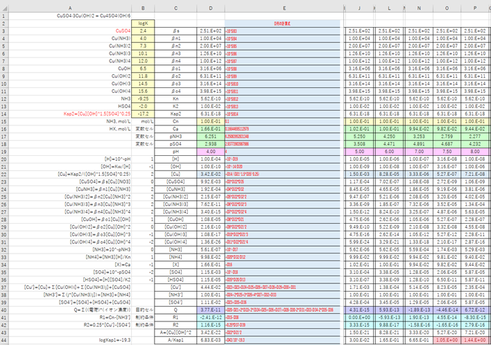 全濃度Cn mol/Lのアンモニアを含みpHを様々に変化させた溶液に対する塩基性硫酸銅(CuSO4・3Cu(OH)2)の溶解度(S)をエクセルで求めます。pHの調整は強酸(HX)または強塩基(NaOH)の添加によって行い、添加による溶液の体積の変化はないものとします。活量係数は考慮しません。