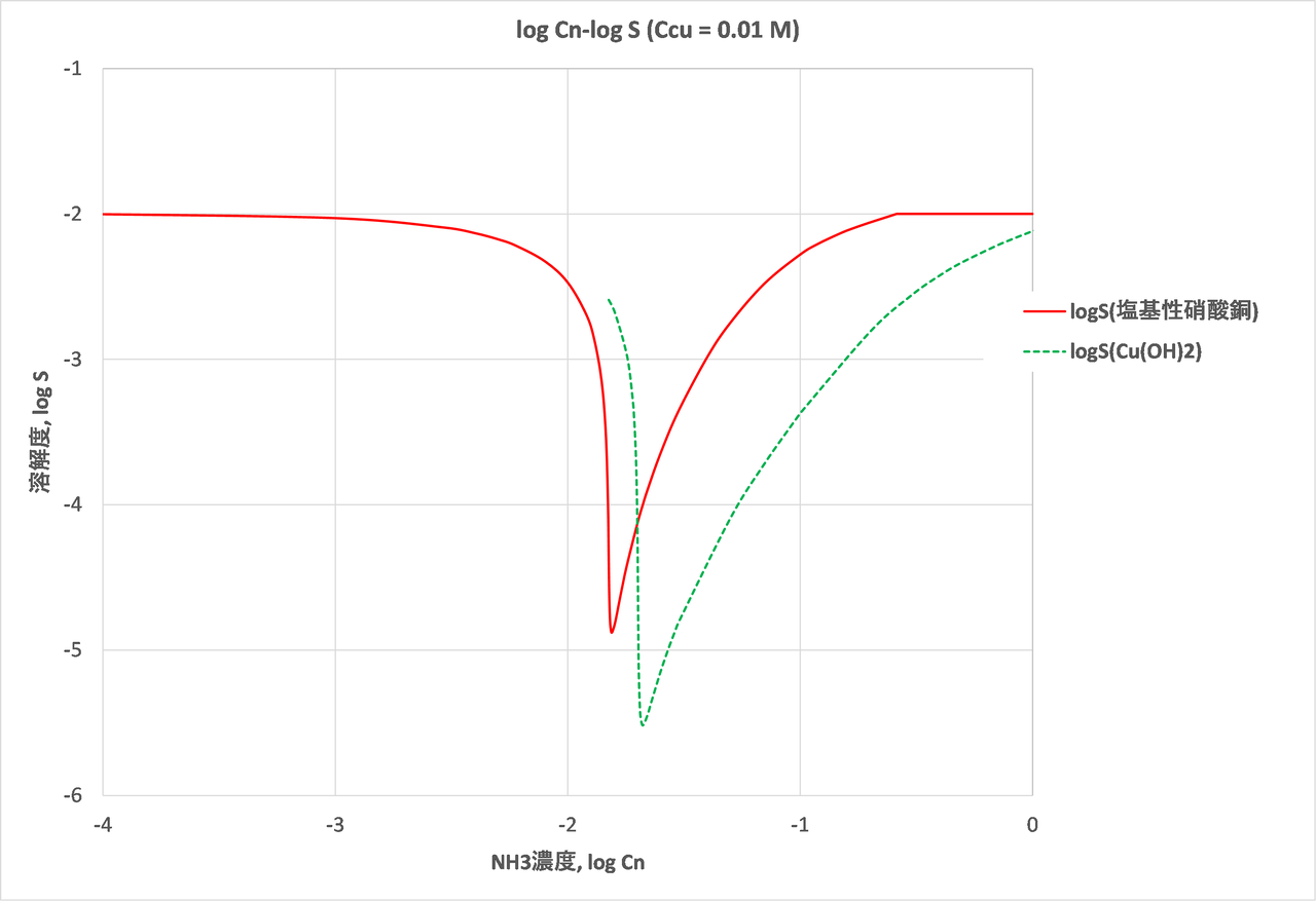 = 0.01 mol/Lの硝酸銅溶液に、濃度がCn mol/Lとなるようにアンモニアを添加し、塩基性硝酸銅(Cu(NO3)2・3Cu(OH)2)が沈殿するときの溶液中の各化学種濃度および全銅濃度[Cu’](または溶解度S)を求めます。アンモニアの添加による体積の変化は無視します。また活量係数は考慮しません。
