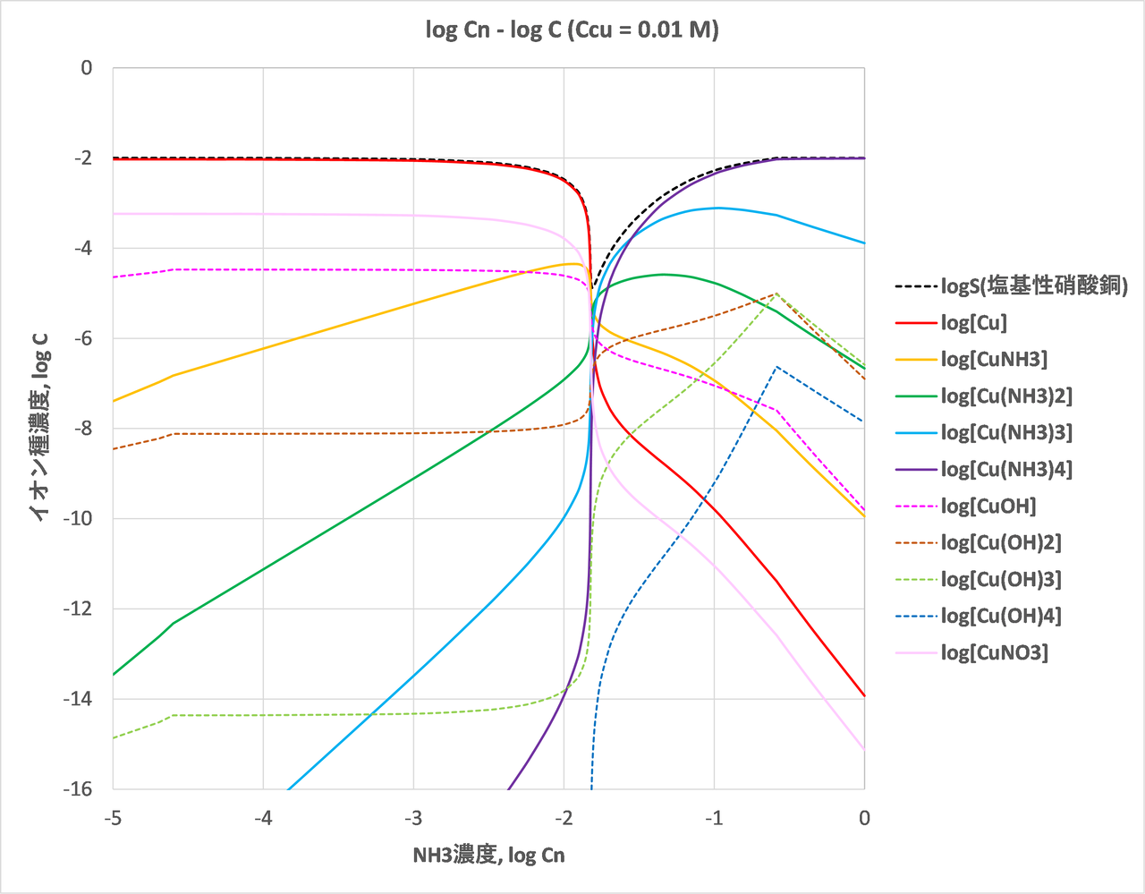 硝酸銅 Ccu = 0.01 mol/L、アンモニア Cn = 10^-5~1 mol/Lの場合について、計算結果(抜粋)を図-1に示します。